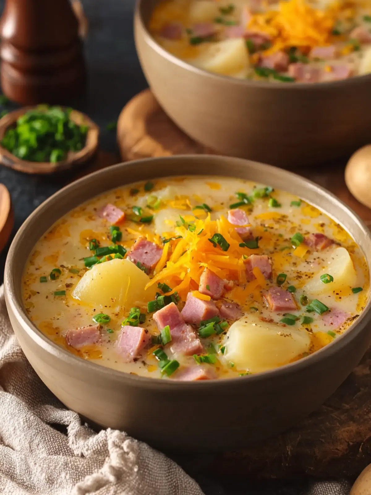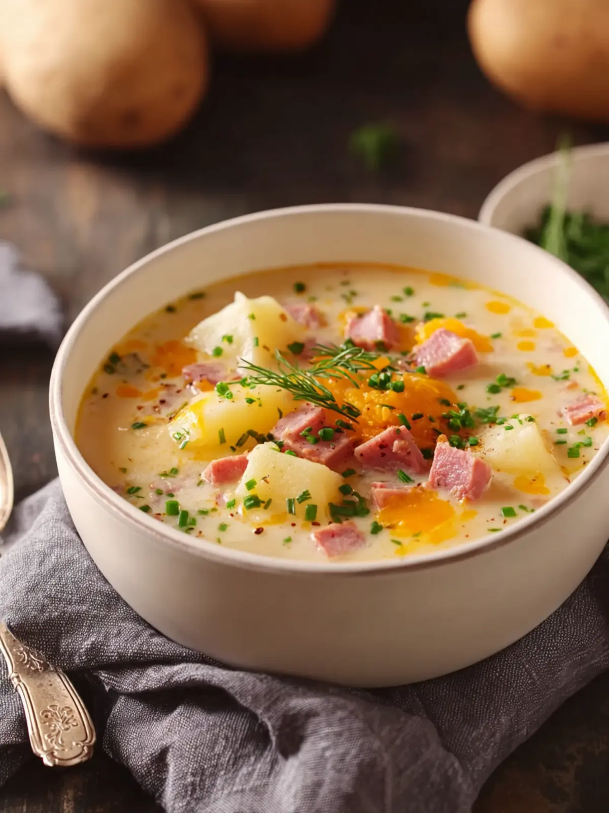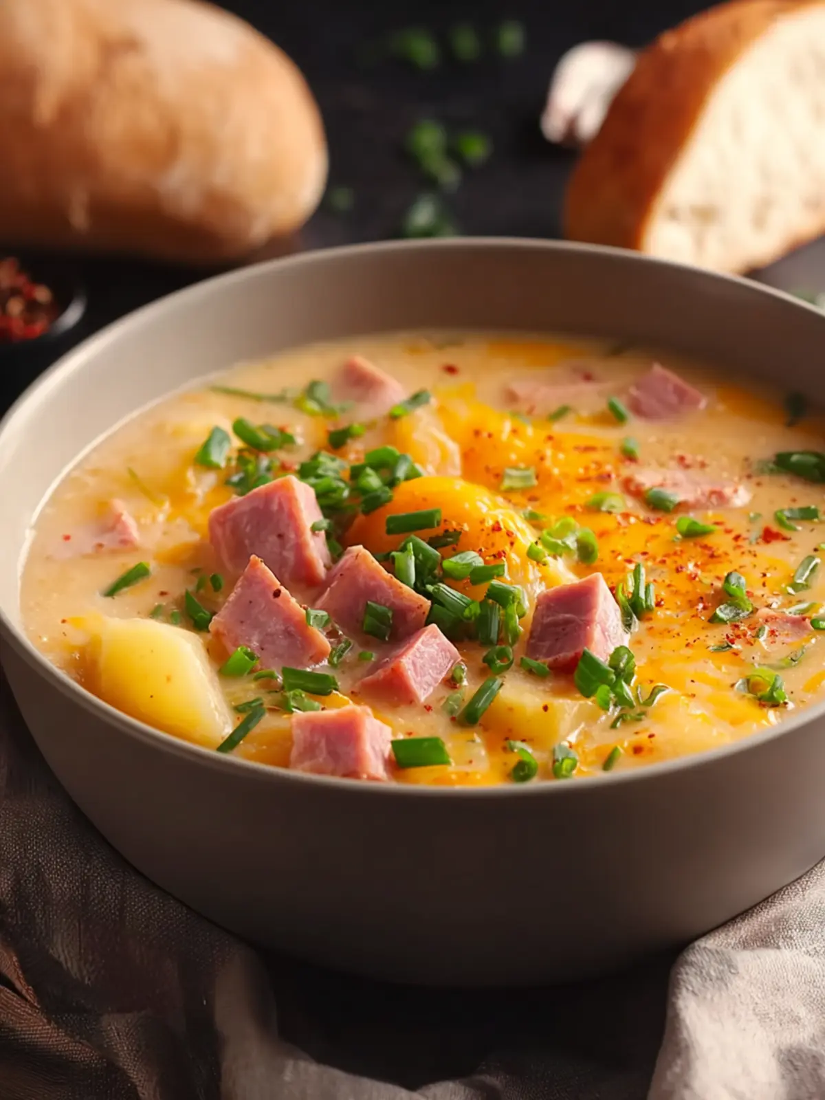 A comforting creamy soup filled with potatoes, ham, and vegetables, perfect for a cozy meal.