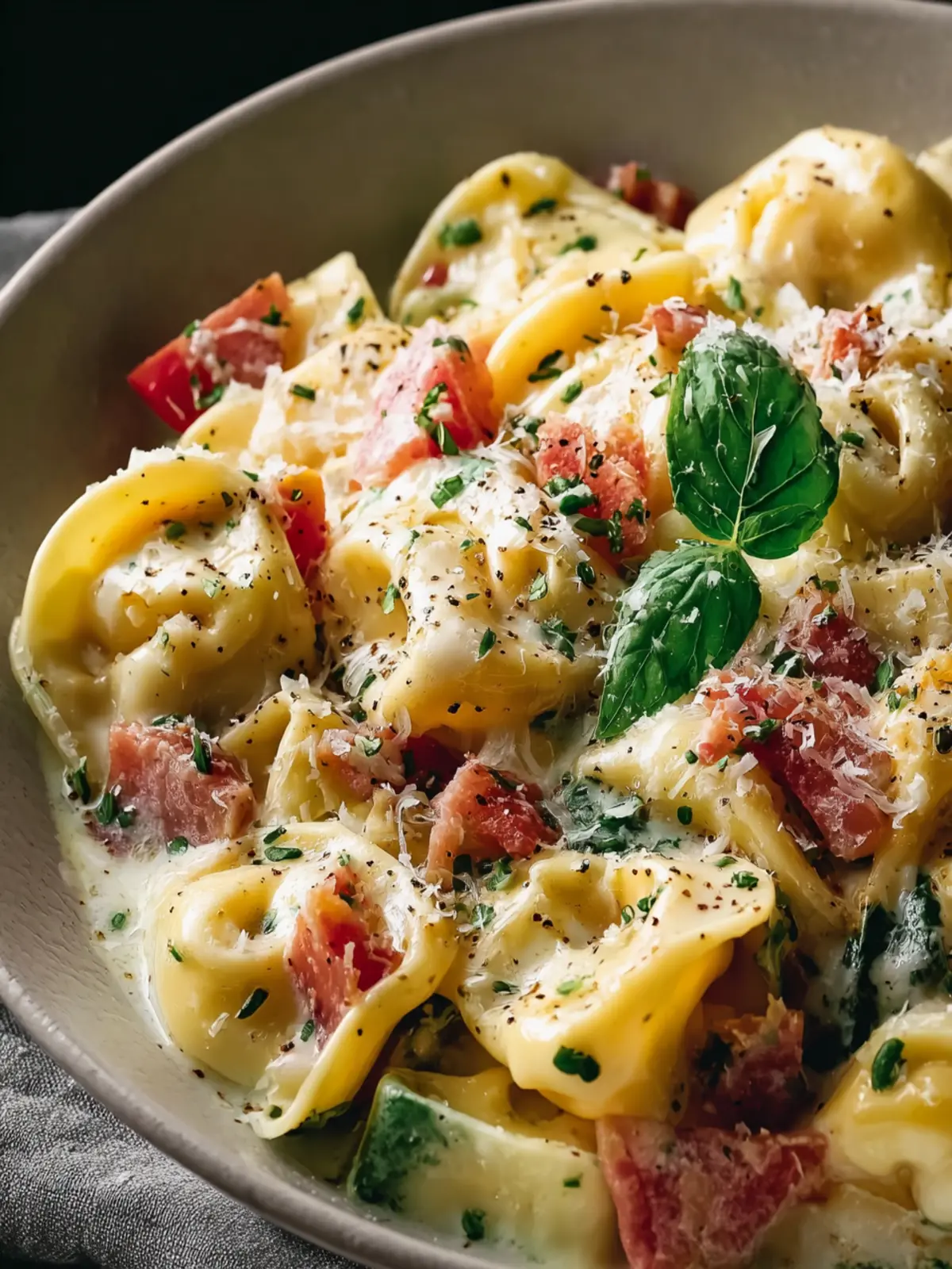 This creamy cheese tortellini dish features savory prosciutto, rich heavy cream, and fresh basil for a delightful flavor combination.