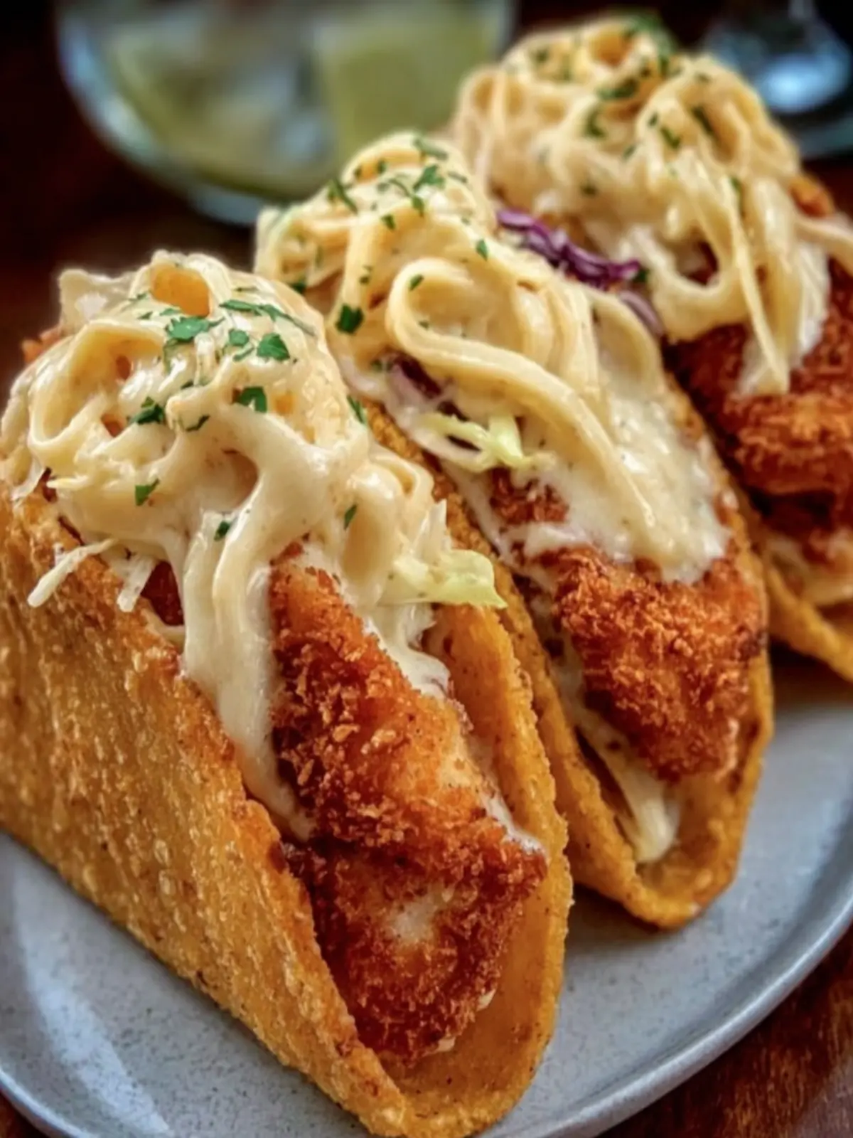 Delicious tacos filled with crispy chicken and creamy Alfredo sauce.