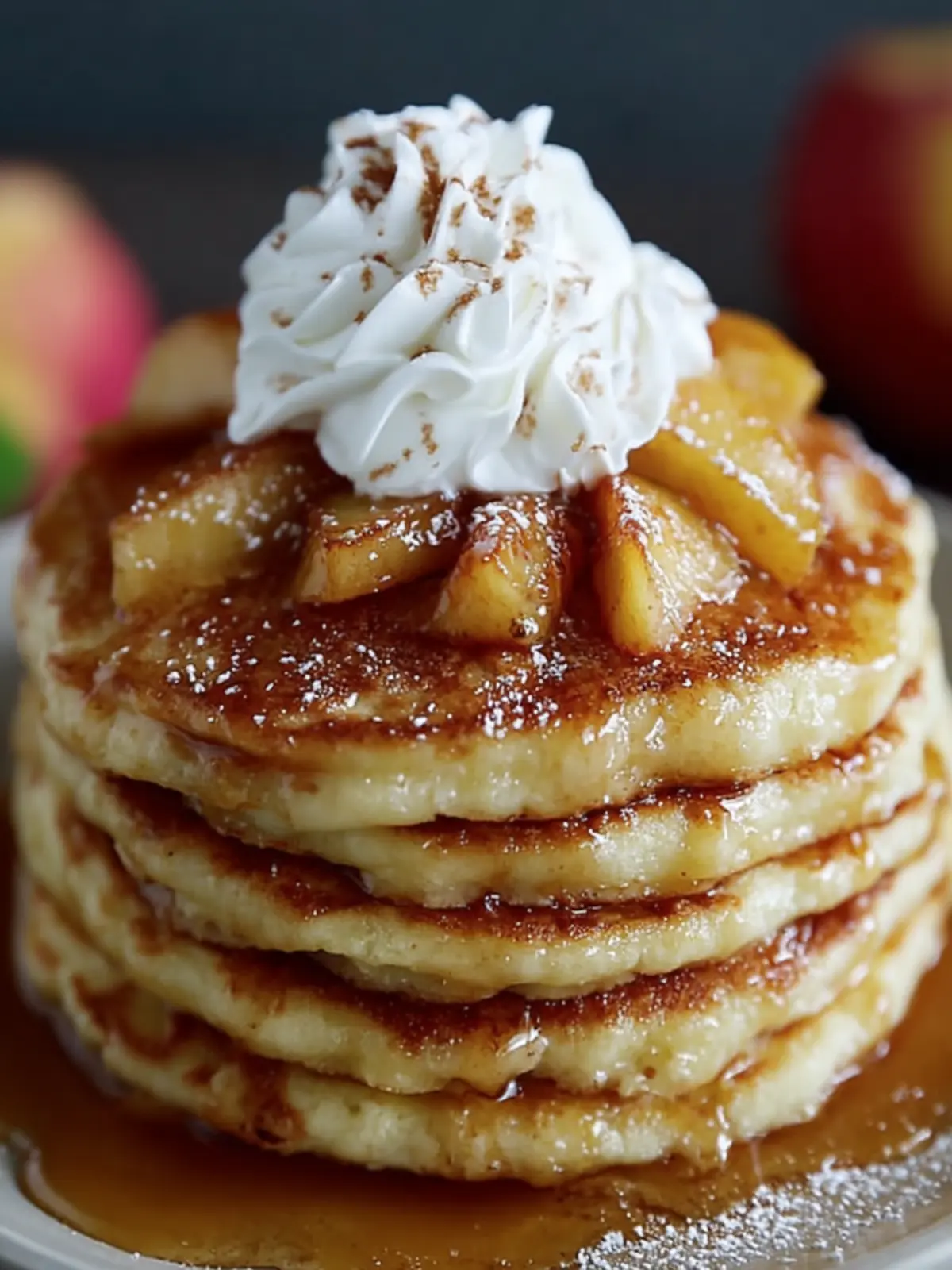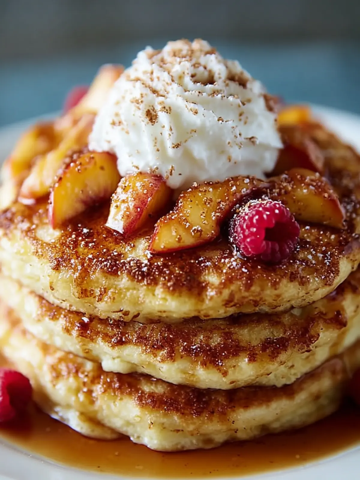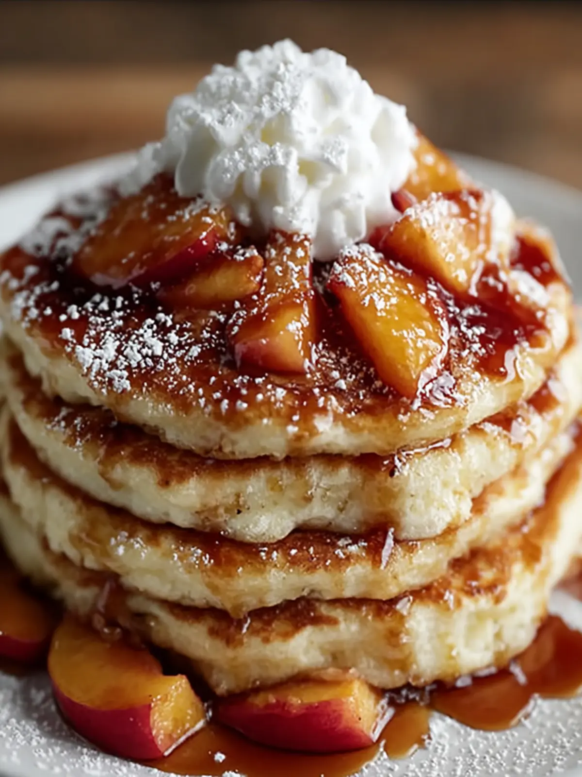 Deliciously fluffy pancakes topped with warm cinnamon peaches, perfect for breakfast or brunch.