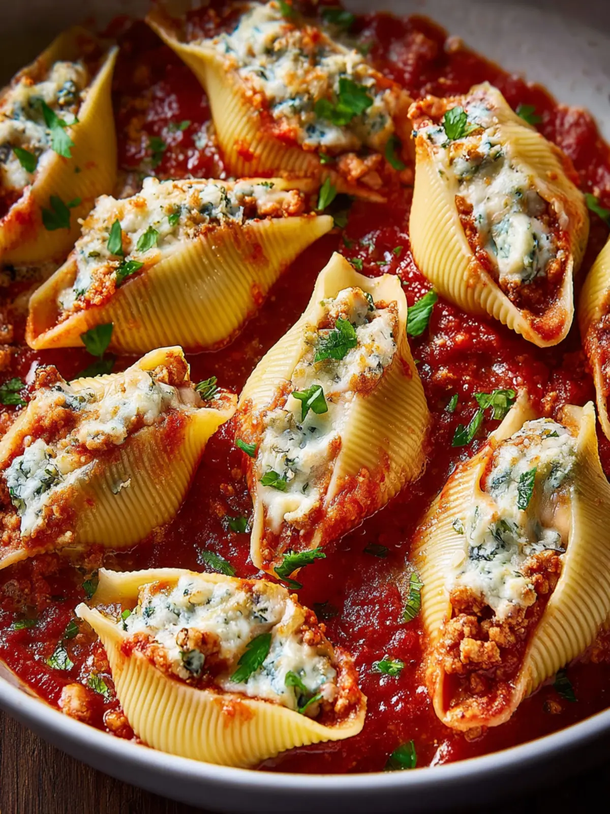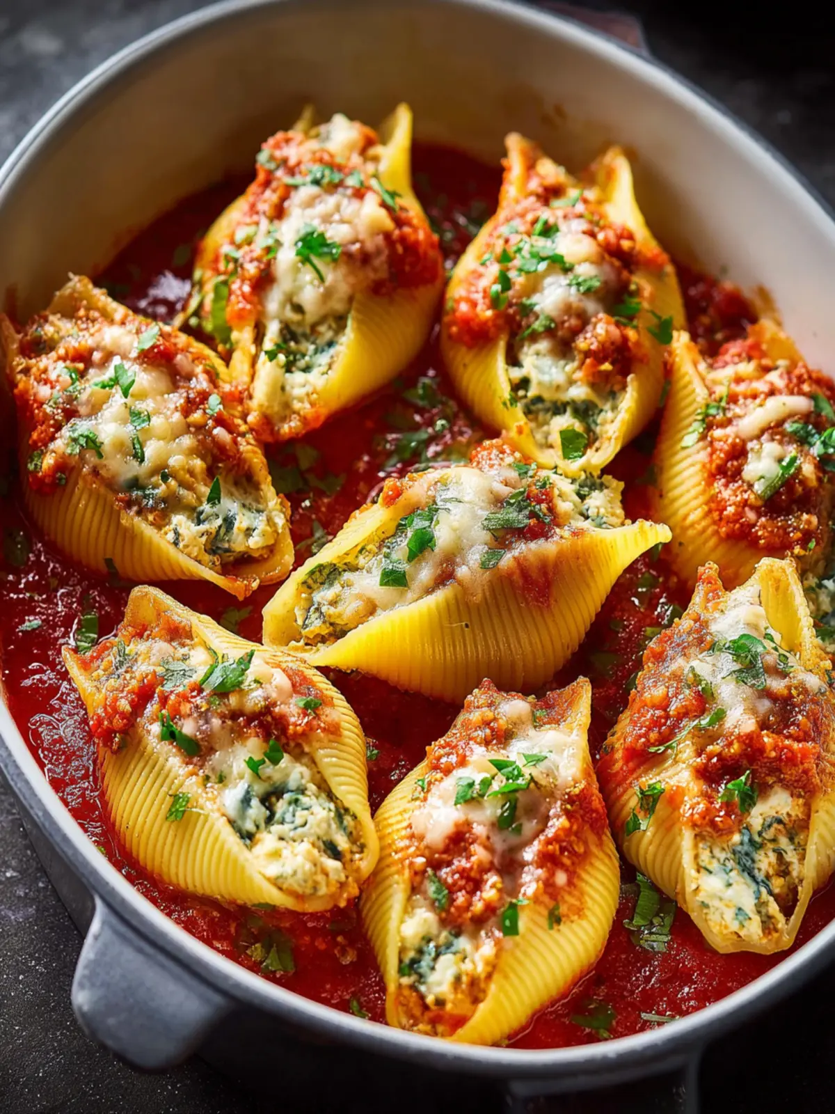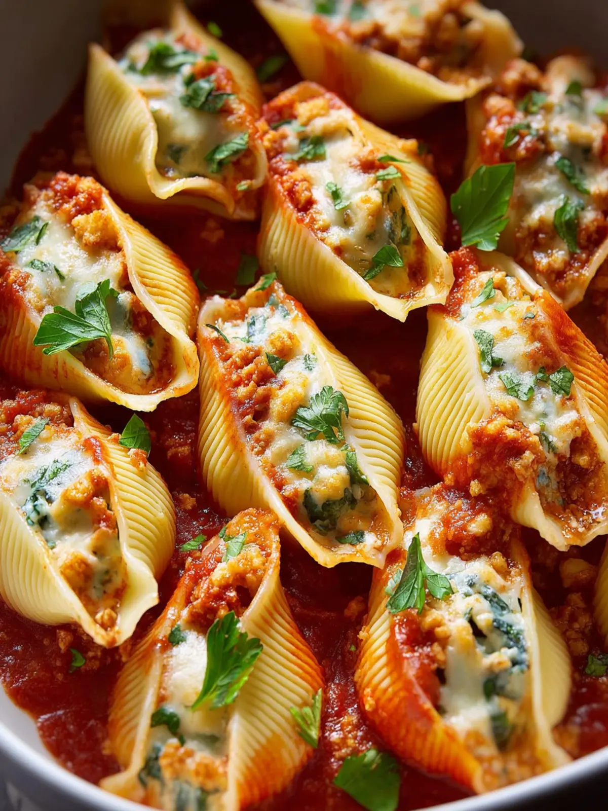 Delicious stuffed jumbo pasta shells filled with ricotta, mozzarella, and Parmesan cheese, baked in marinara sauce.