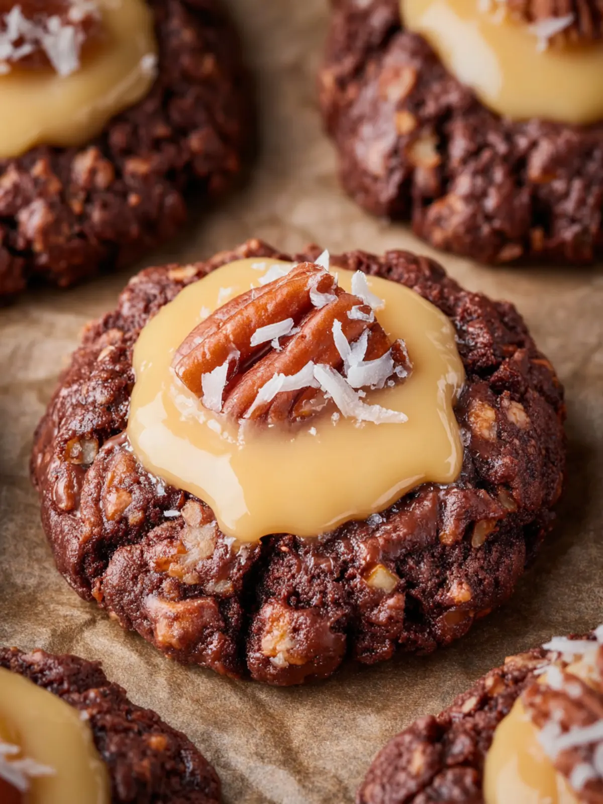 Deliciously rich chocolate cookies filled with a creamy coconut and pecan topping.