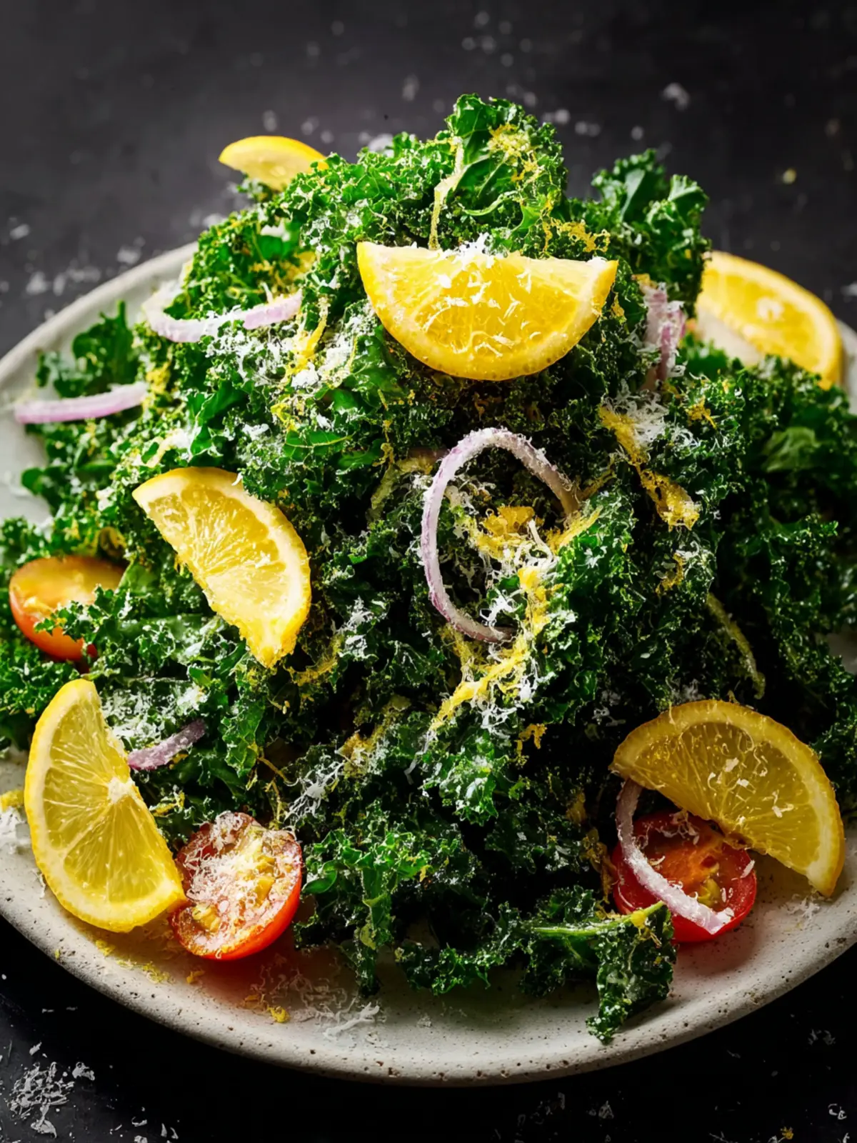 A refreshing kale salad with Parmesan cheese, cherry tomatoes, and a tangy lemon dressing.
