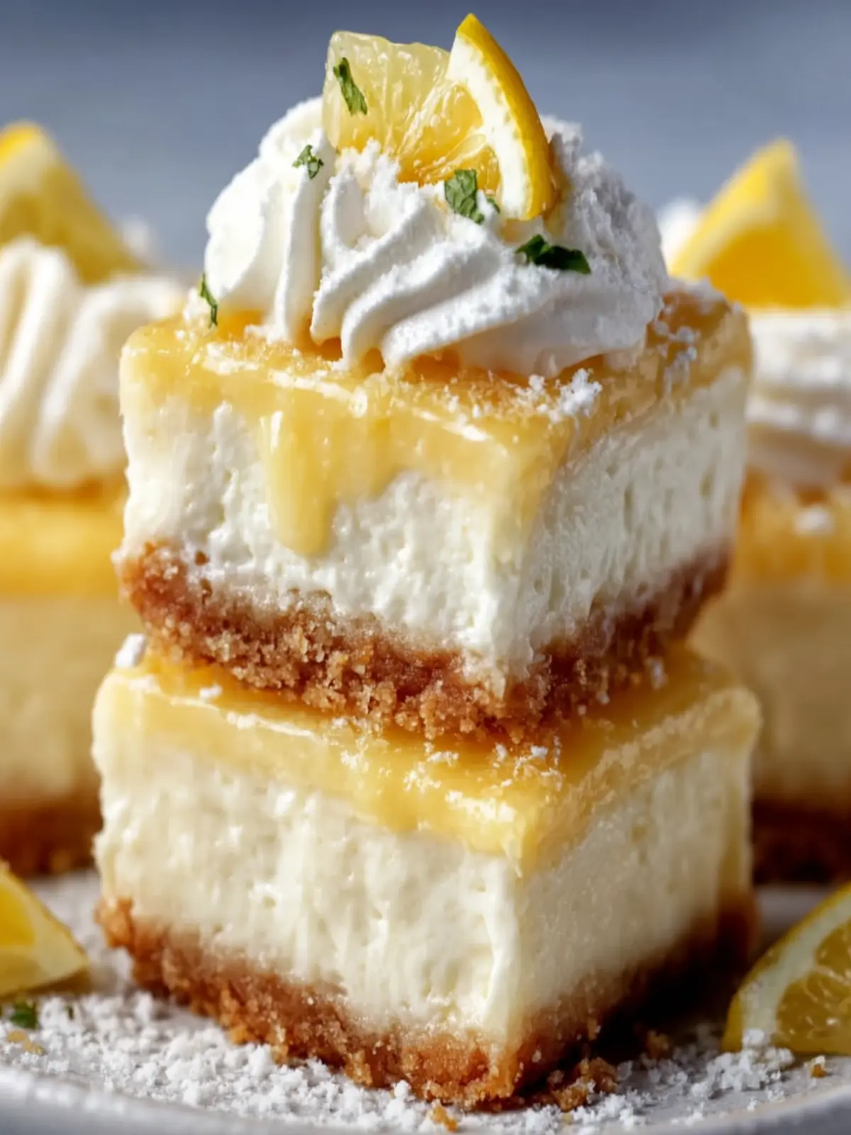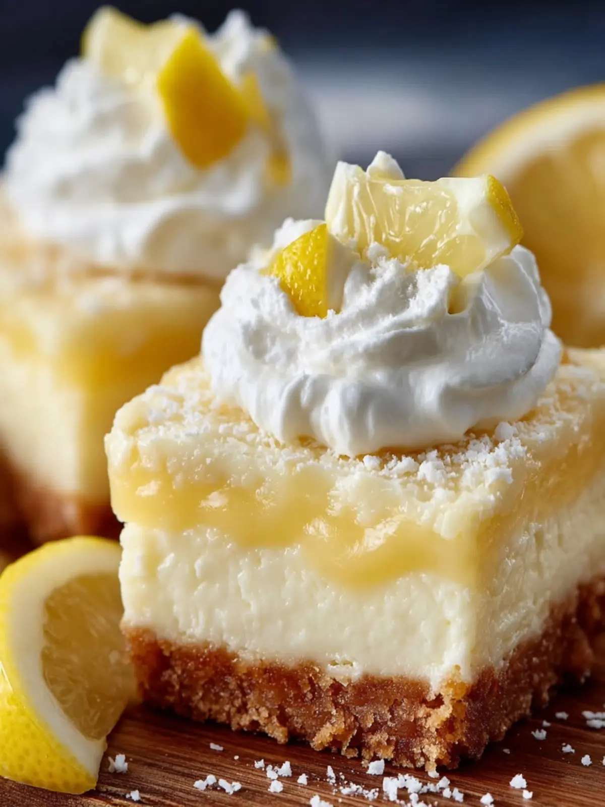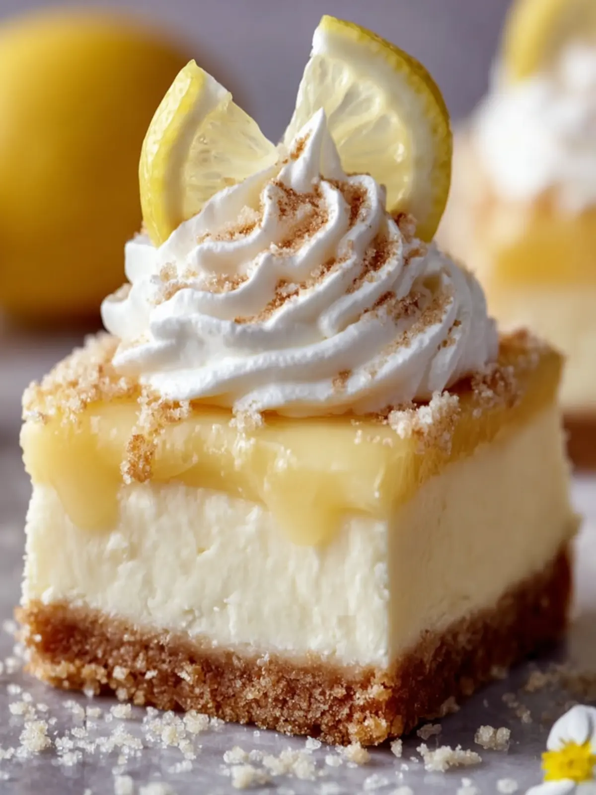 - Serve: Once set, cut into bars and garnish with whipped cream and fresh lemon slices.