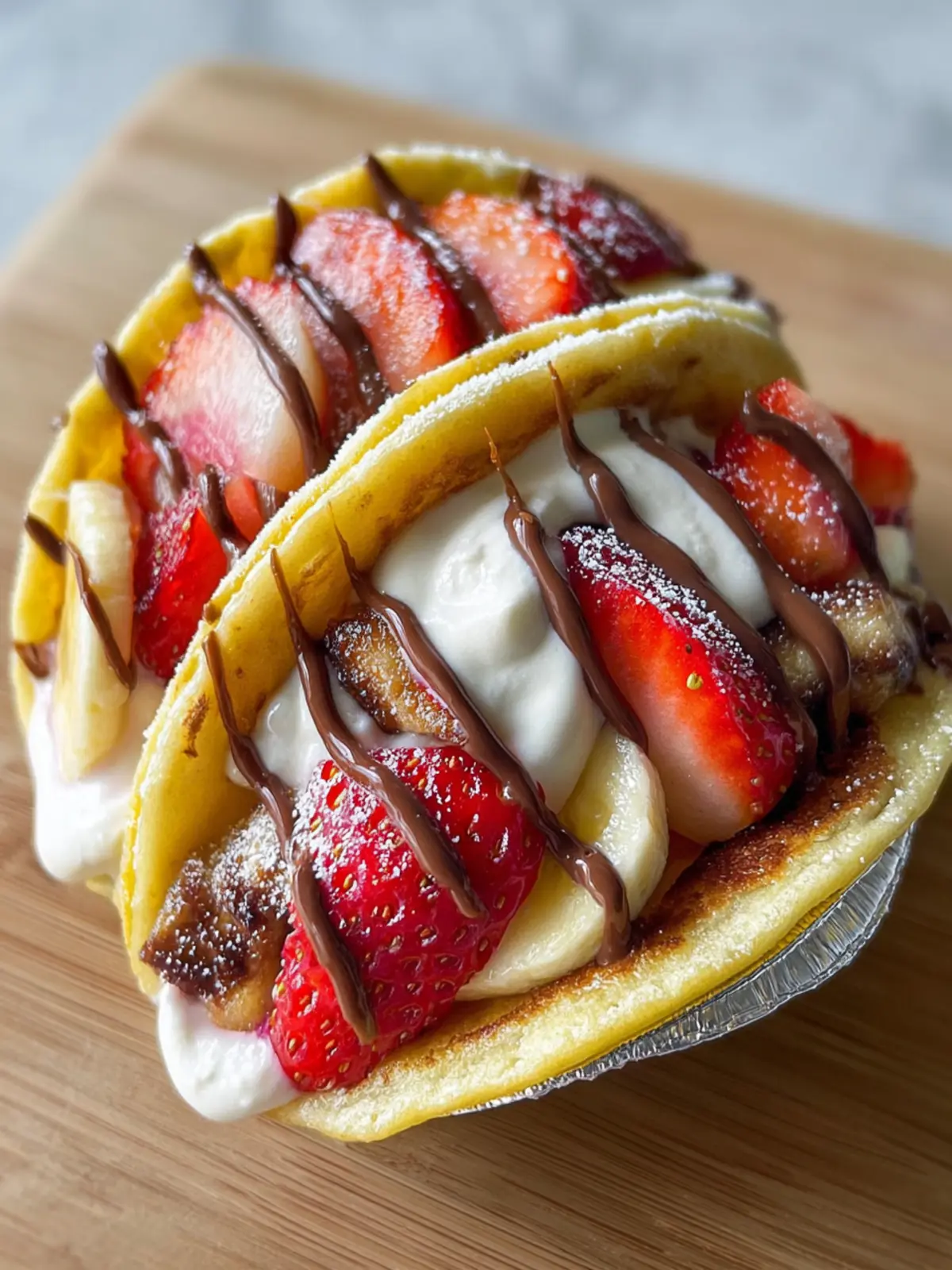 - Spoon the creamy filling generously inside each folded pancake taco. Top with the prepared mixed berries and sliced strawberries. Drizzle with chocolate syrup and melted peanut butter for an extra burst of flavor.