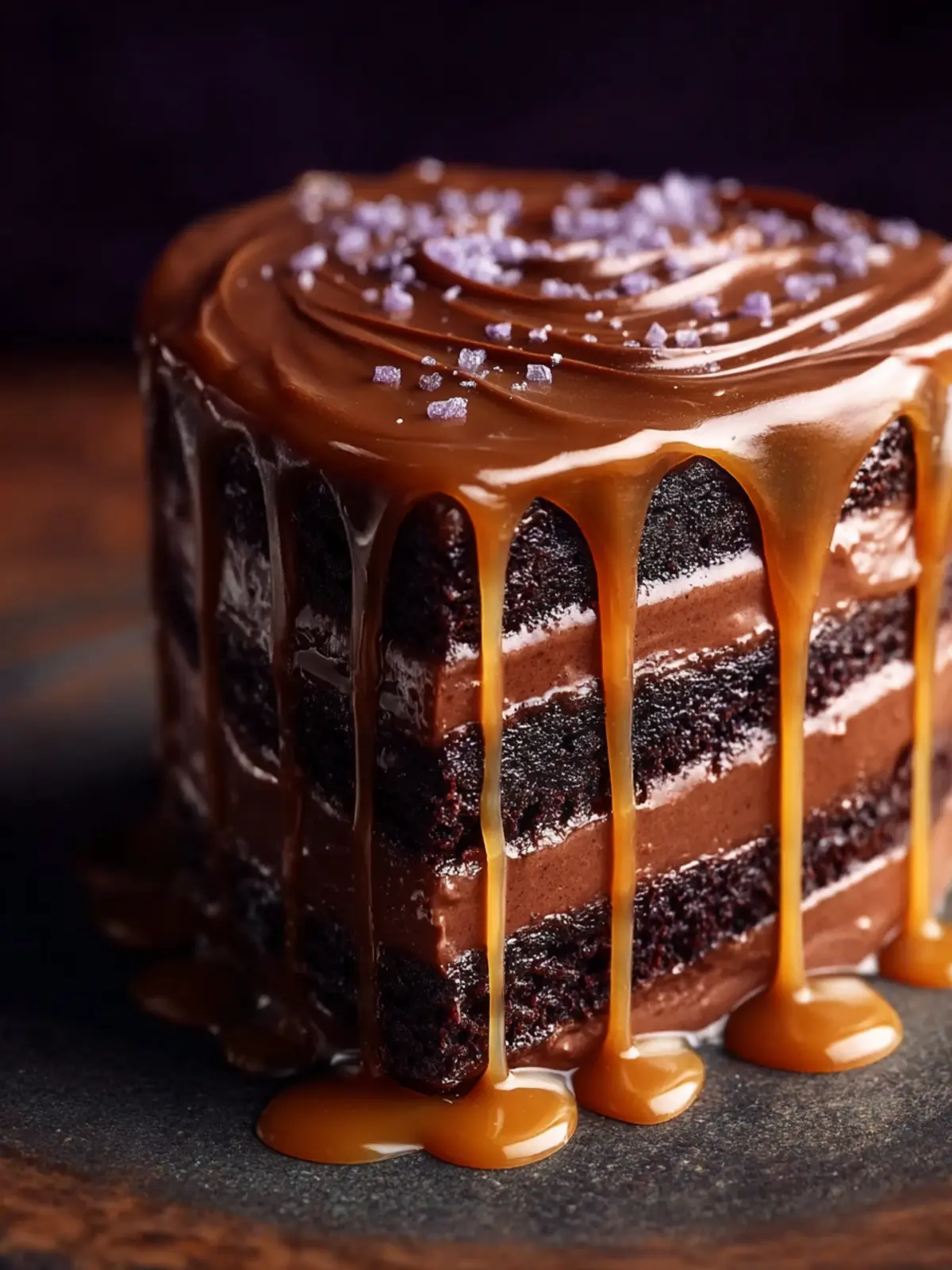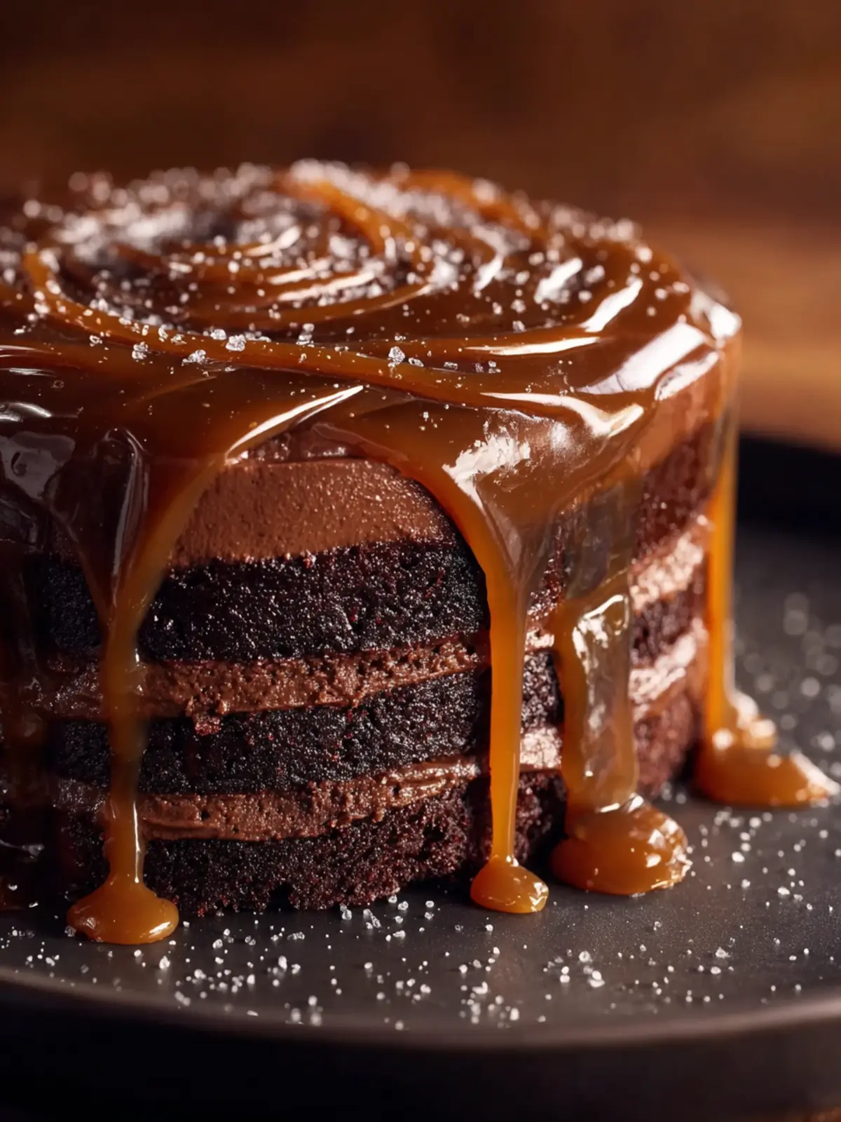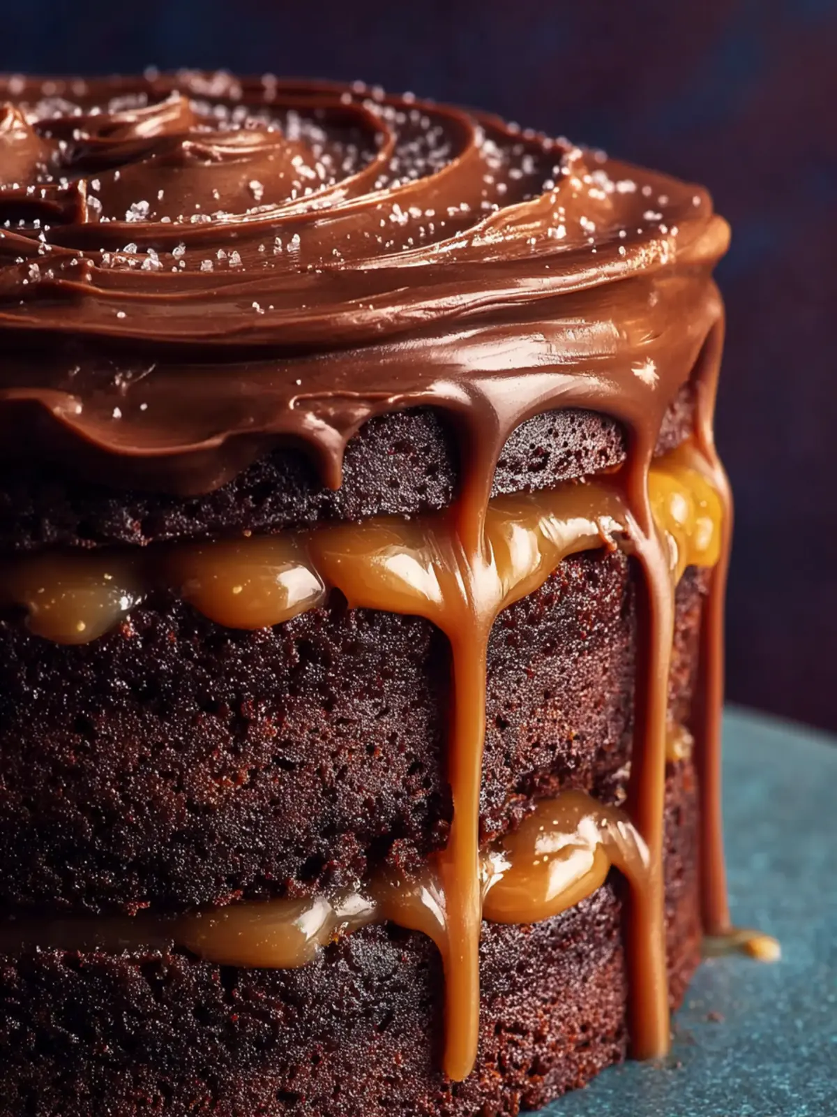 A delicious and decadent chocolate cake with salted caramel and chocolate frosting.