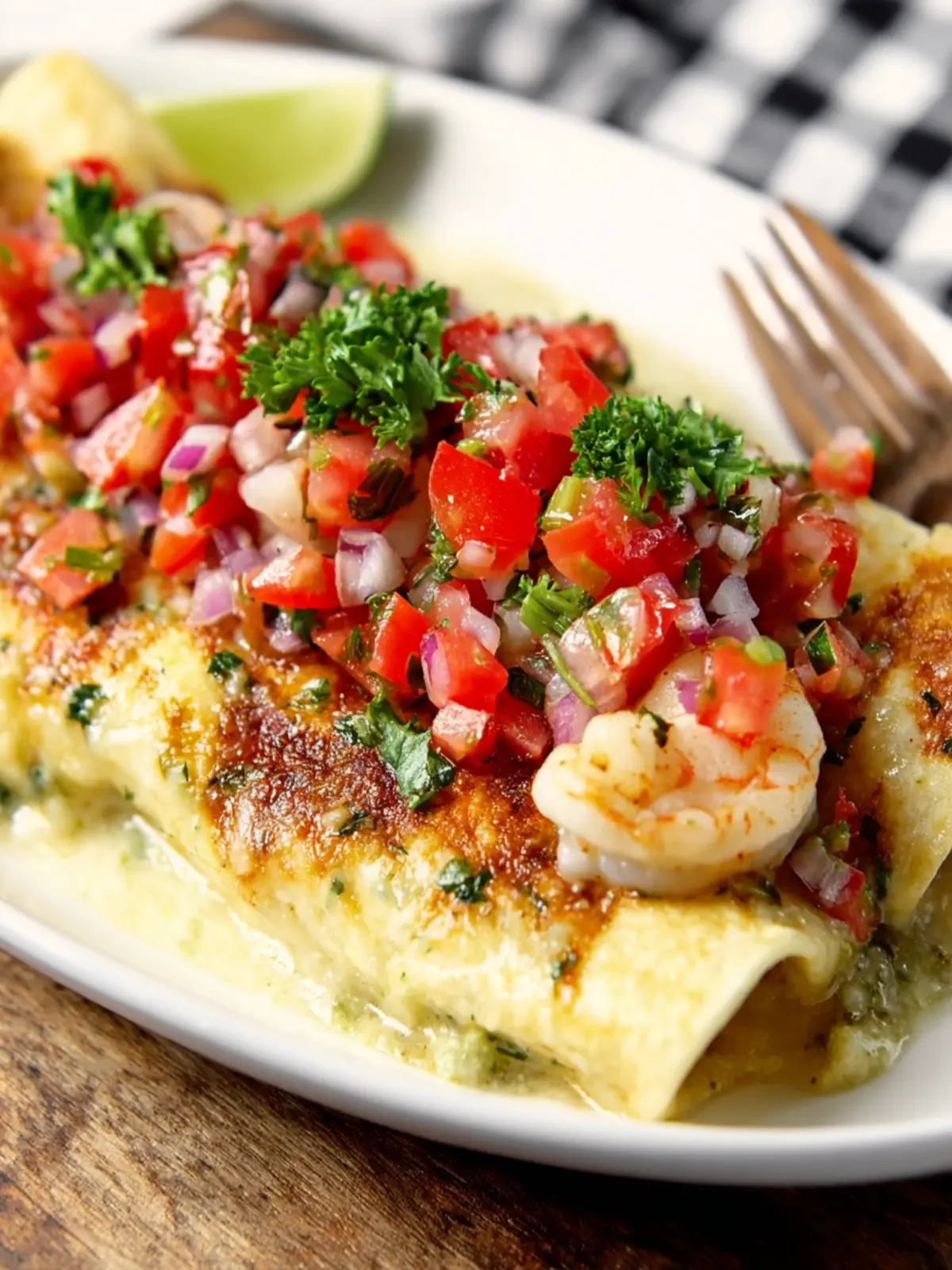 Delicious shrimp and crab enchiladas topped with cheese and pico de gallo.