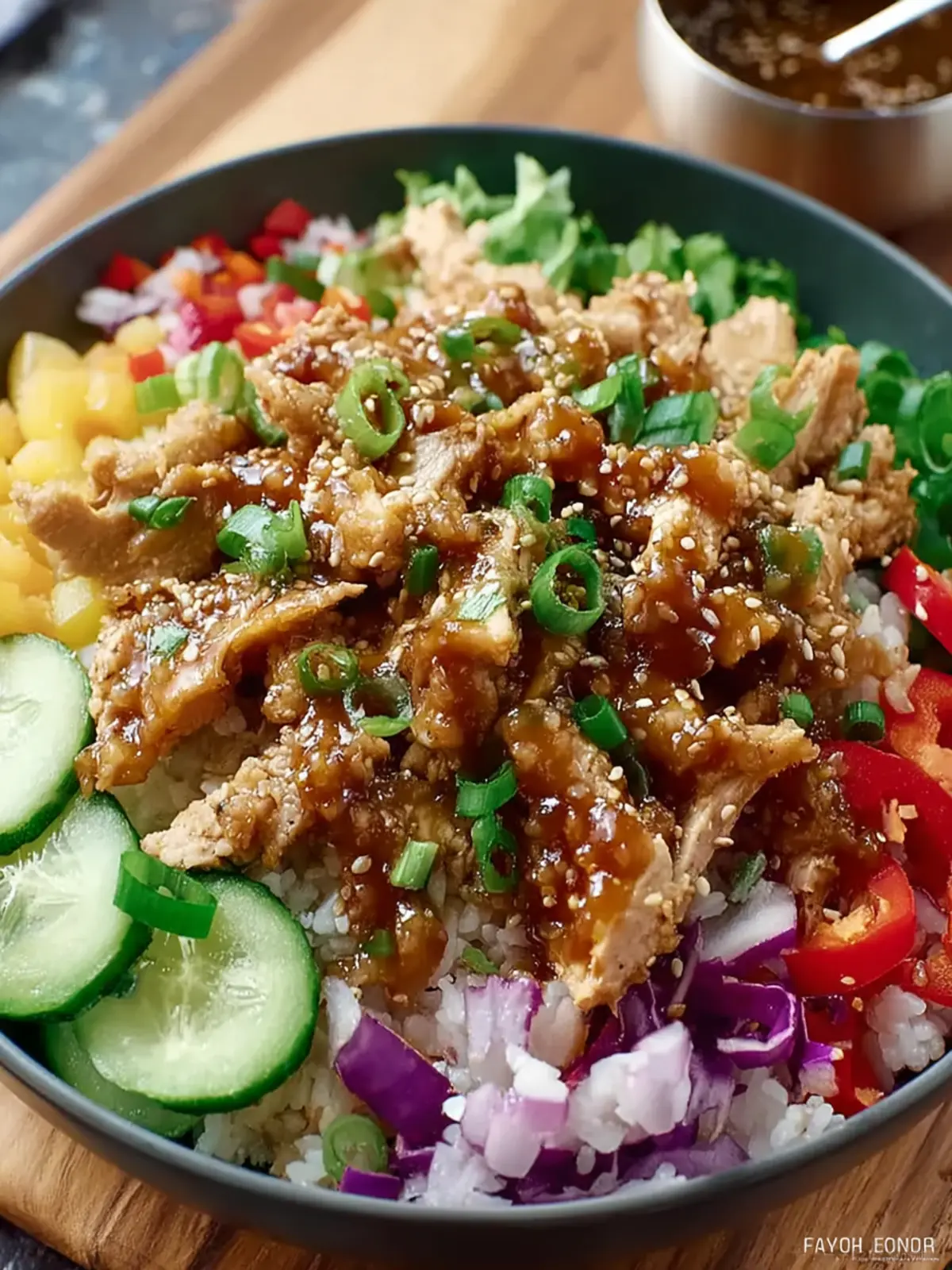 • Variety of Textures: The crisp rice provides a satisfying crunch, while the tender teriyaki chicken and crunchy veggies create a beautiful contrast that keeps each bite interesting.