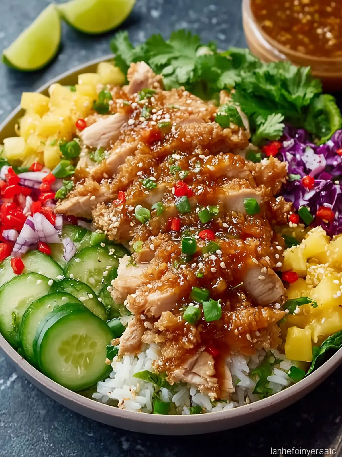 A delicious teriyaki chicken salad featuring crispy jasmine rice and fresh vegetables.