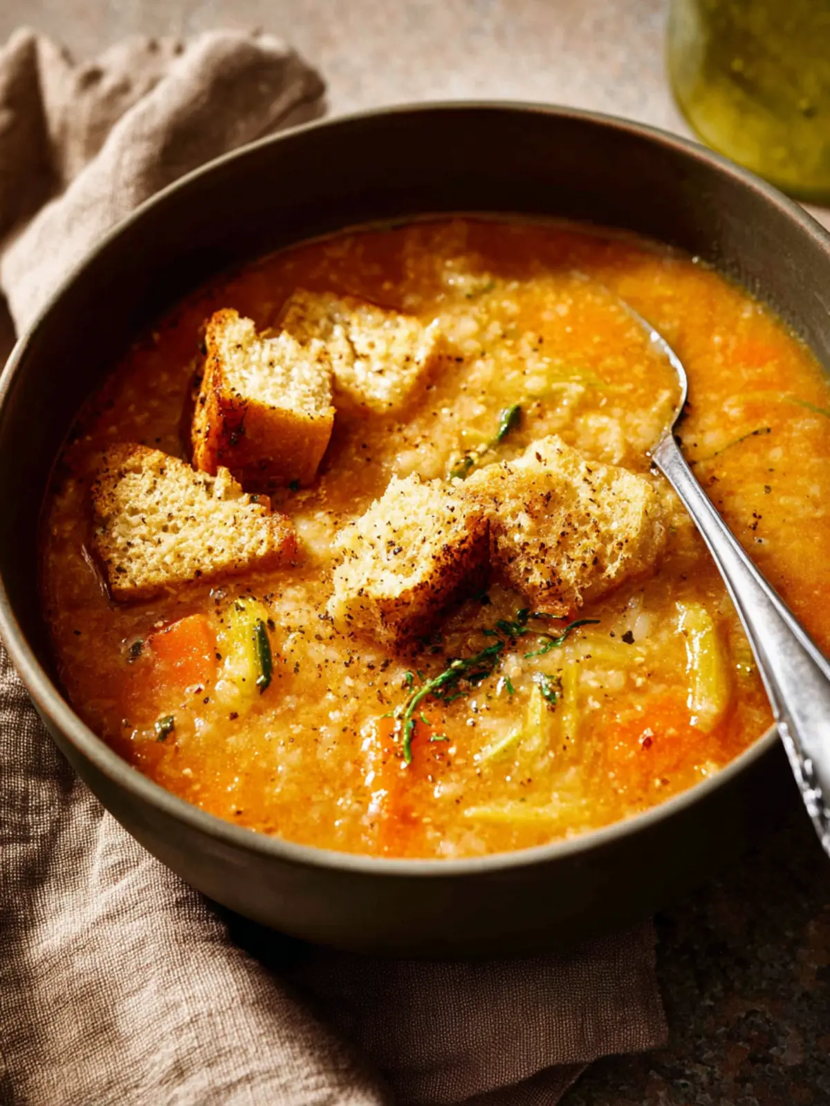 A hearty and comforting vegetable bread soup that makes use of day-old bread.
