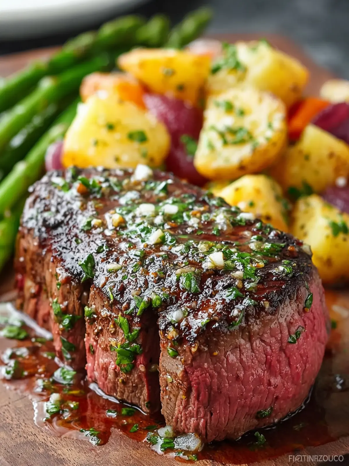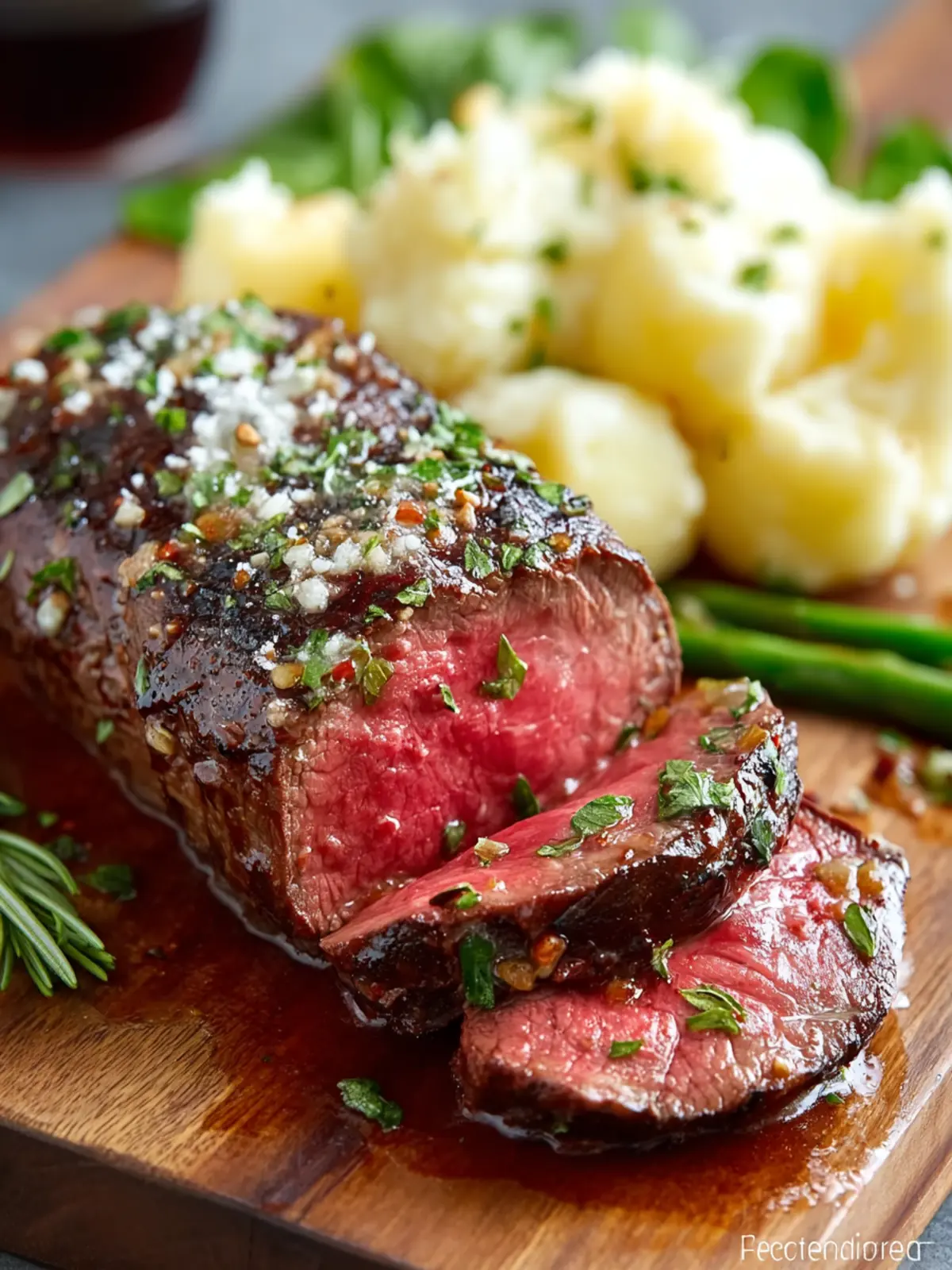 A perfectly roasted beef tenderloin coated with a flavorful herb butter mixture.