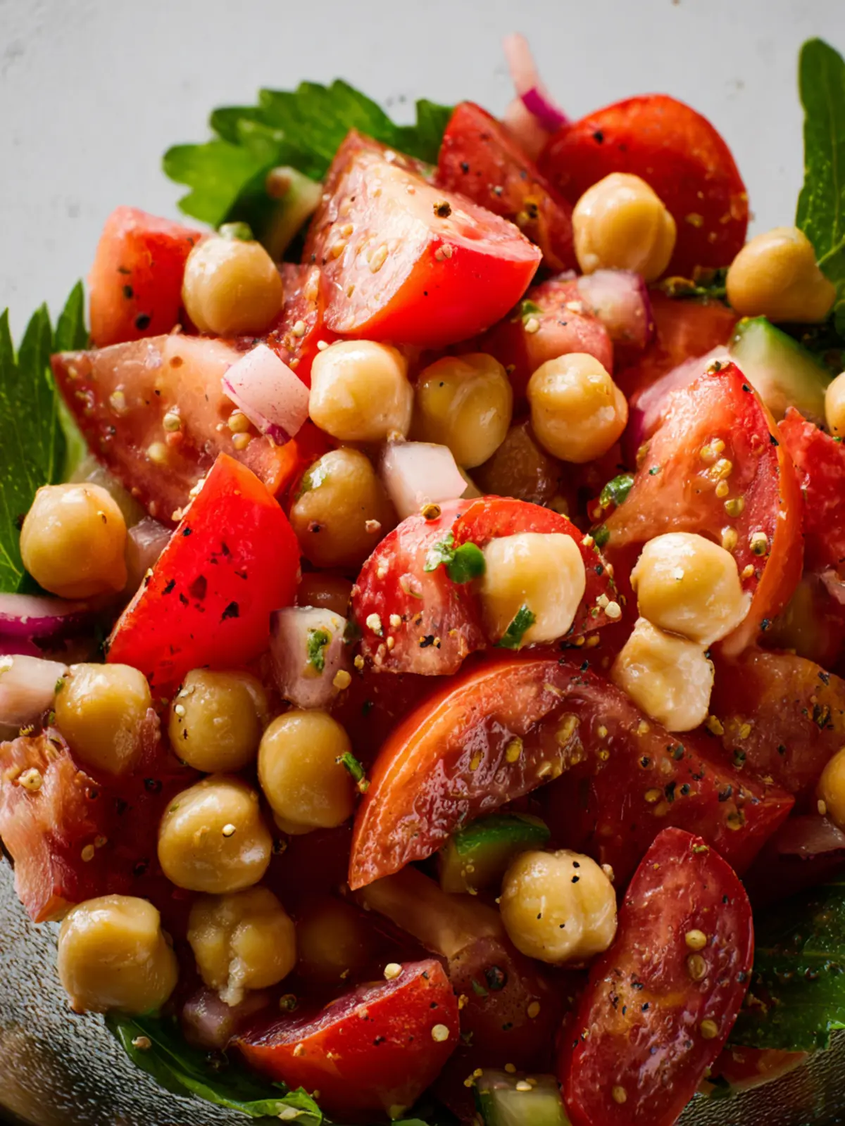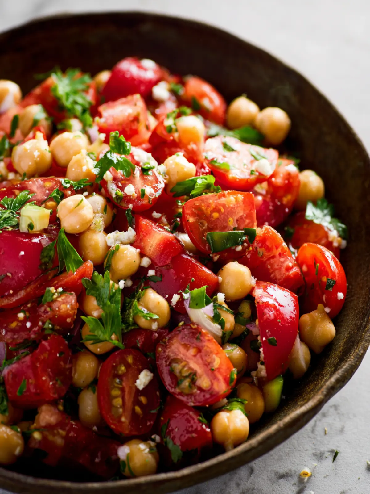 When stored properly in an airtight container, your tomato chickpea salad can last around 3 to 5 days in the fridge. However, be prepared for the texture of the tomatoes to change a bit as they release moisture. If you notice excess liquid at the bottom of the container, it’s perfectly fine; just give it a good stir before serving again!