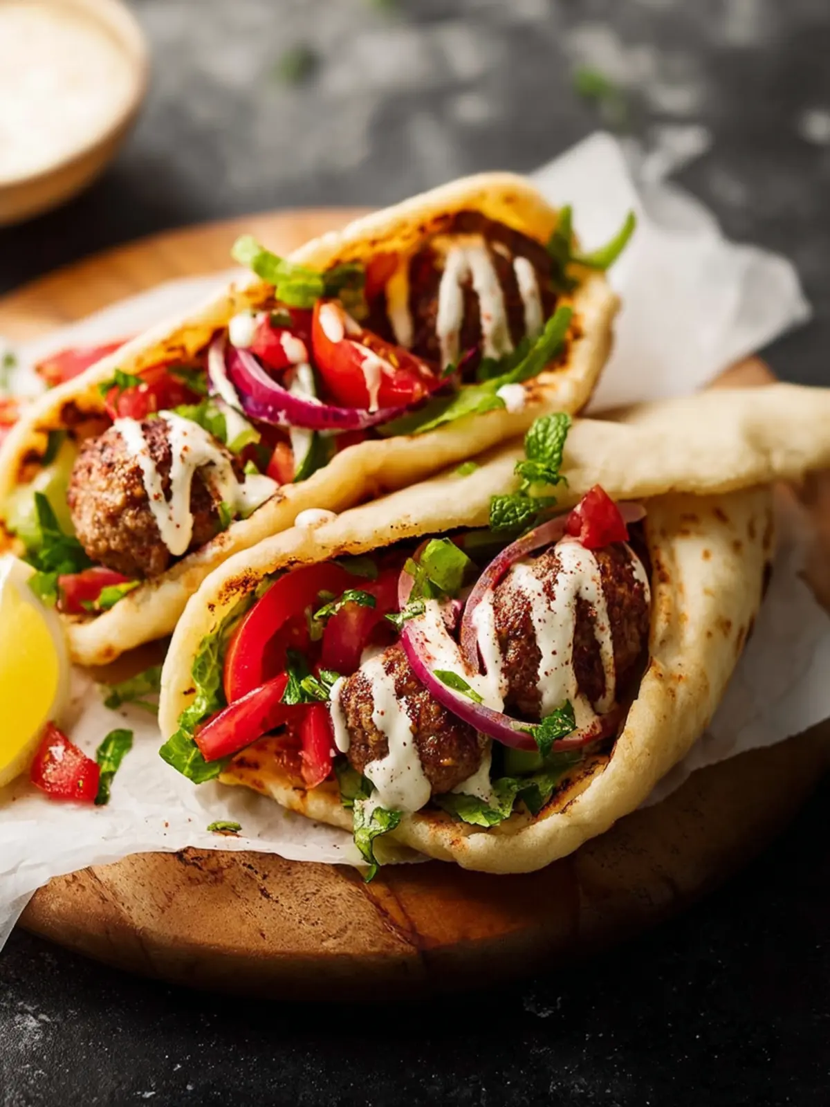 - Assemble the Pitas: Warm 4 Pita breads or flatbreads. Fill each with a handful of the salad, add 1–2 turkey koftas, and drizzle generously with tahini sauce. Top with Pickled turnips or Sumac Onions and Shredded lettuce if you like.