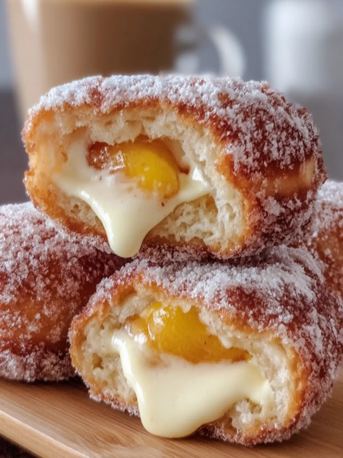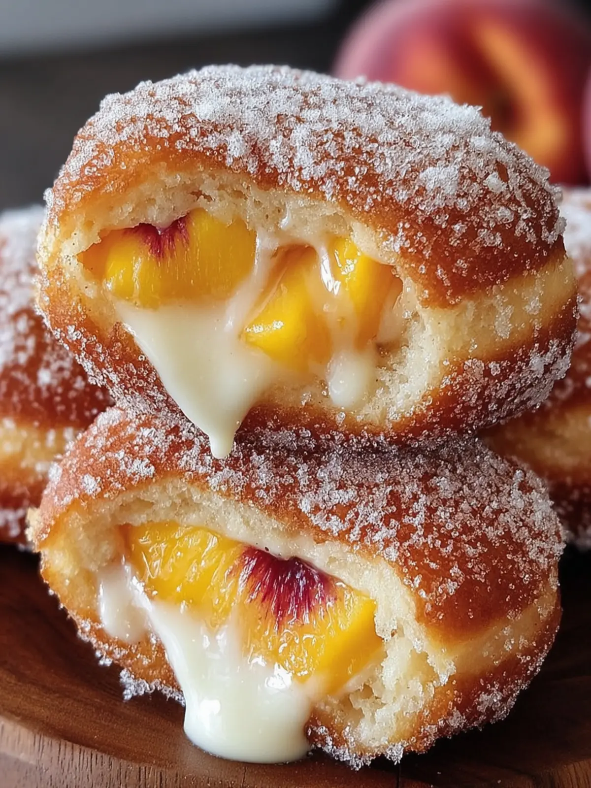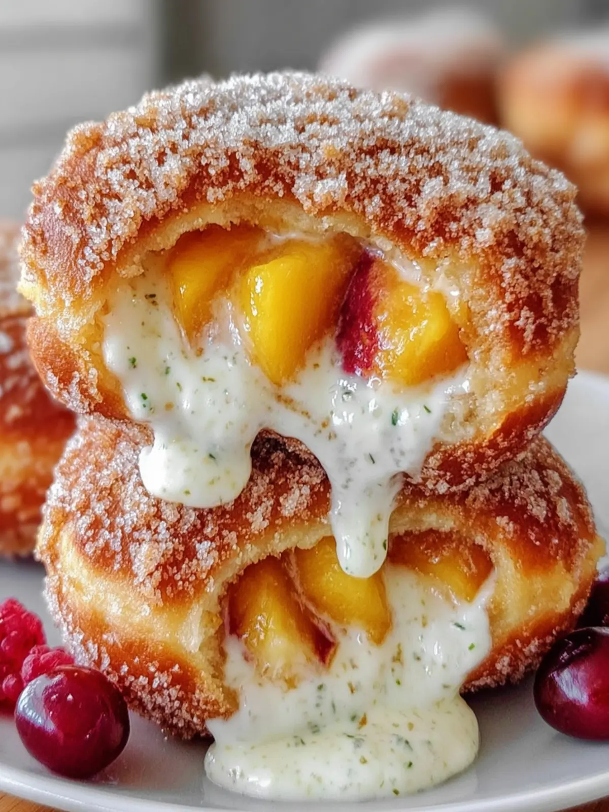 These warm peach-filled donuts offer a delightful blend of sweetness and fruitiness, perfect for any dessert lover.