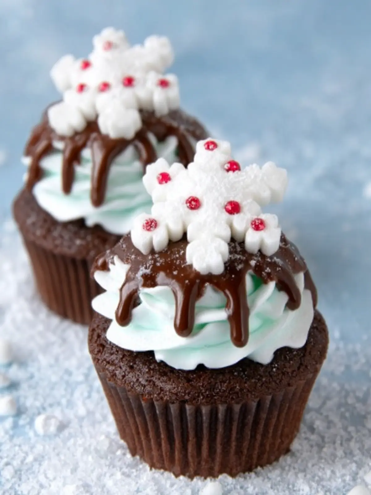 Delicious cupcakes perfect for winter celebrations, topped with fluffy frosting and festive decorations.